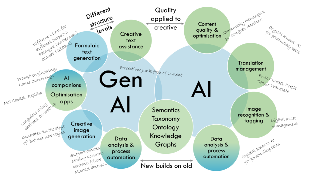 Given that AI doesn’t actually “create” but “generates” through reformulating and re-interpreting existing content. It took a while until the limitations were understood. Generative AI was widely touted as being the miracle solution to all content problems. The “tell the LLM a few vague sentences and you’ll get award-winning text-based content and images” phase was short-lived. The word salads, the hallucinations, the unrealistic body appendages, and the invented references dulled the shine on the new toy. However, as the technical folks and the tech-inclined content people experimented and the dust began to settle, there was some clarity around what worked, what didn’t, and how you could improve the results produced.