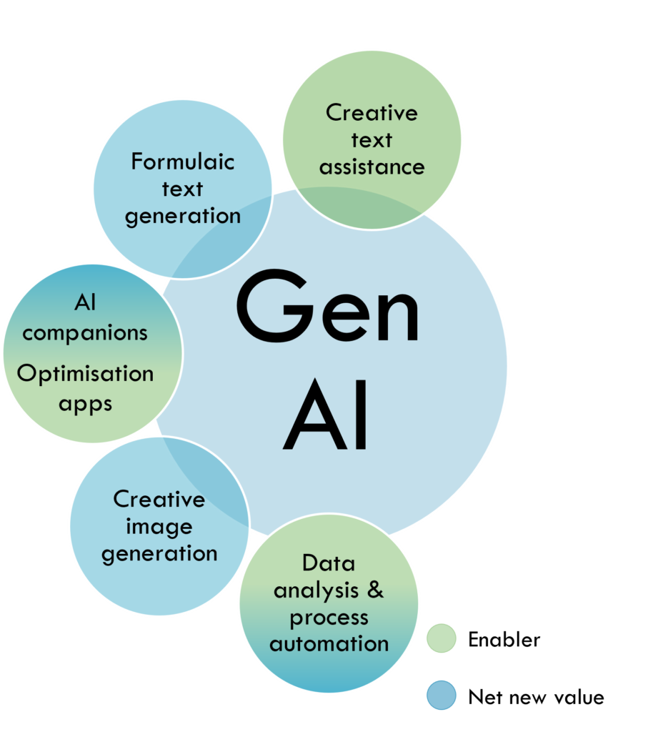 Optimisation apps and AI companions. I’ve grouped them together because there is some sort of ongoing interaction, despite those interactions being vastly different. Not all LLMs are created equal, and some have been developed with particular functions in mind. AI companions could mean apps such as Microsoft Copilot, which acts as an assistant to content developers to optimise content quality – what used to be called an “assistant” – as well as assistance with drafting of emails and texts – a sort of predictive completion. This could include voice assistants such as Amazon’s Alexa or Apple’s Siri. Another type of AI companion, using a very different type of LLM, carries on conversations as a “synthetic friend”. These companions can chat, play games, roleplay, or even give advice.