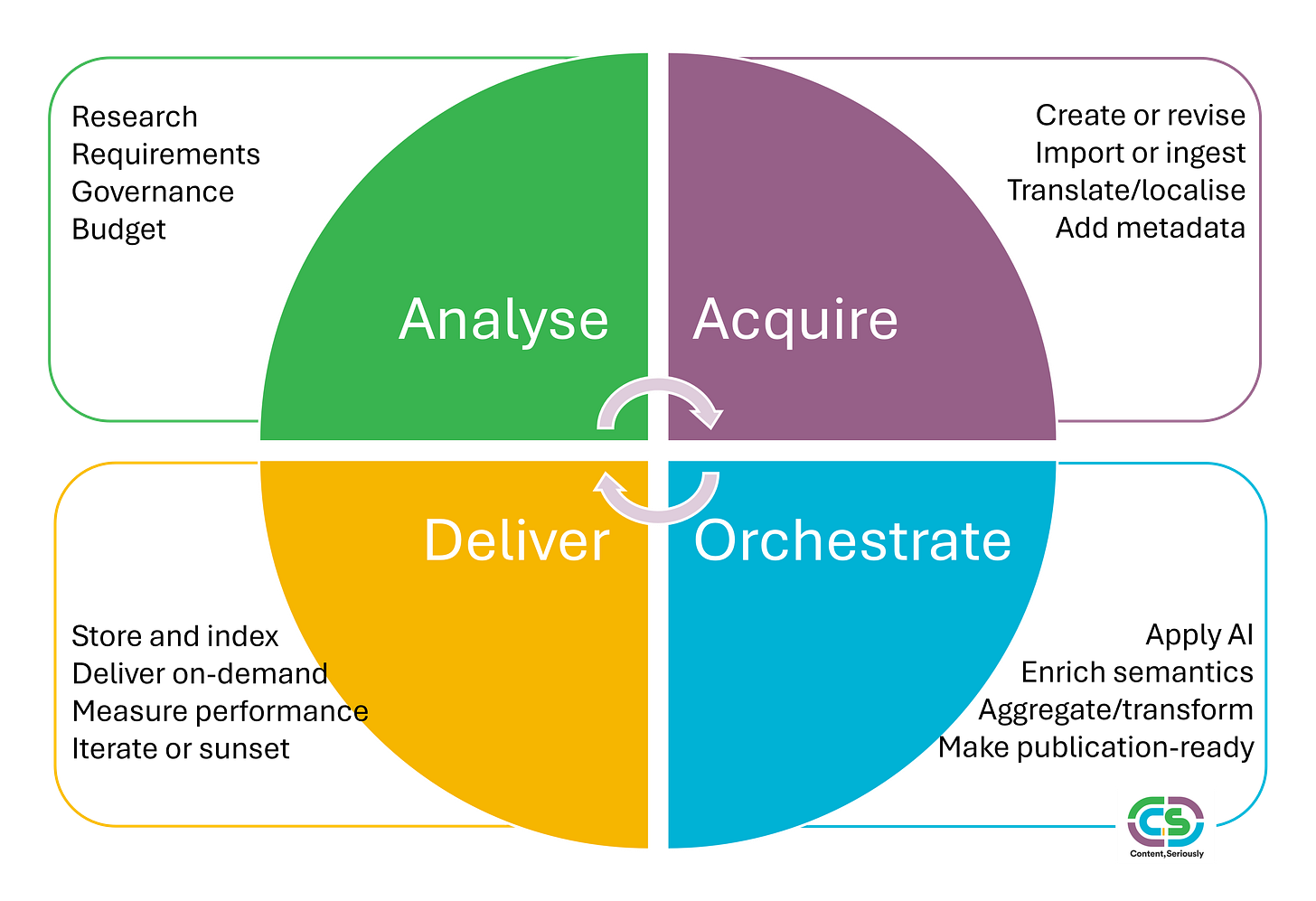 That’s become a less common scenario in today’s business environments. Content production is circular, and works on a lifecycle model of creation, orchestration, and delivery, repeated many times over. This creates a very different set of tensions and complexities than exist in a supply chain.